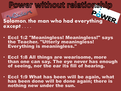 Solomon and Samson picked their philosophies of life. The Bible shows you their lives so you can see that wisdom and physical power separated from God causes great suffering. The reason this is so important is, it can happen to you so easily. You don’t always get to decide what you are going to with your days. The list can get really long that is telling you all the things you need to do each day. It is easy to have a whole day without doing anything with God. Its easy to go a whole month without working on God’s plan for you.